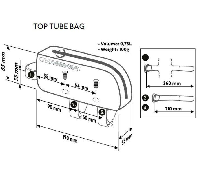 Befestigung: Lenkkopf: 1 Strap; Oberrohr: 2 Straps mit Rahmenschutz der Riemenschnalle