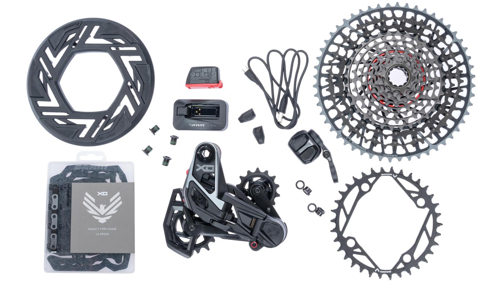 Bestehend aus: Schaltwerk, Schalter POD Ultimate (zusätzlich mit konvexe Knöpfen), Kettenschutzring, Kassettenzahnkranz XG-1295 10-52 Zähne, Kette X0 Eagle Transmission, Akku, Ladergerät mit Kabel, dark polar